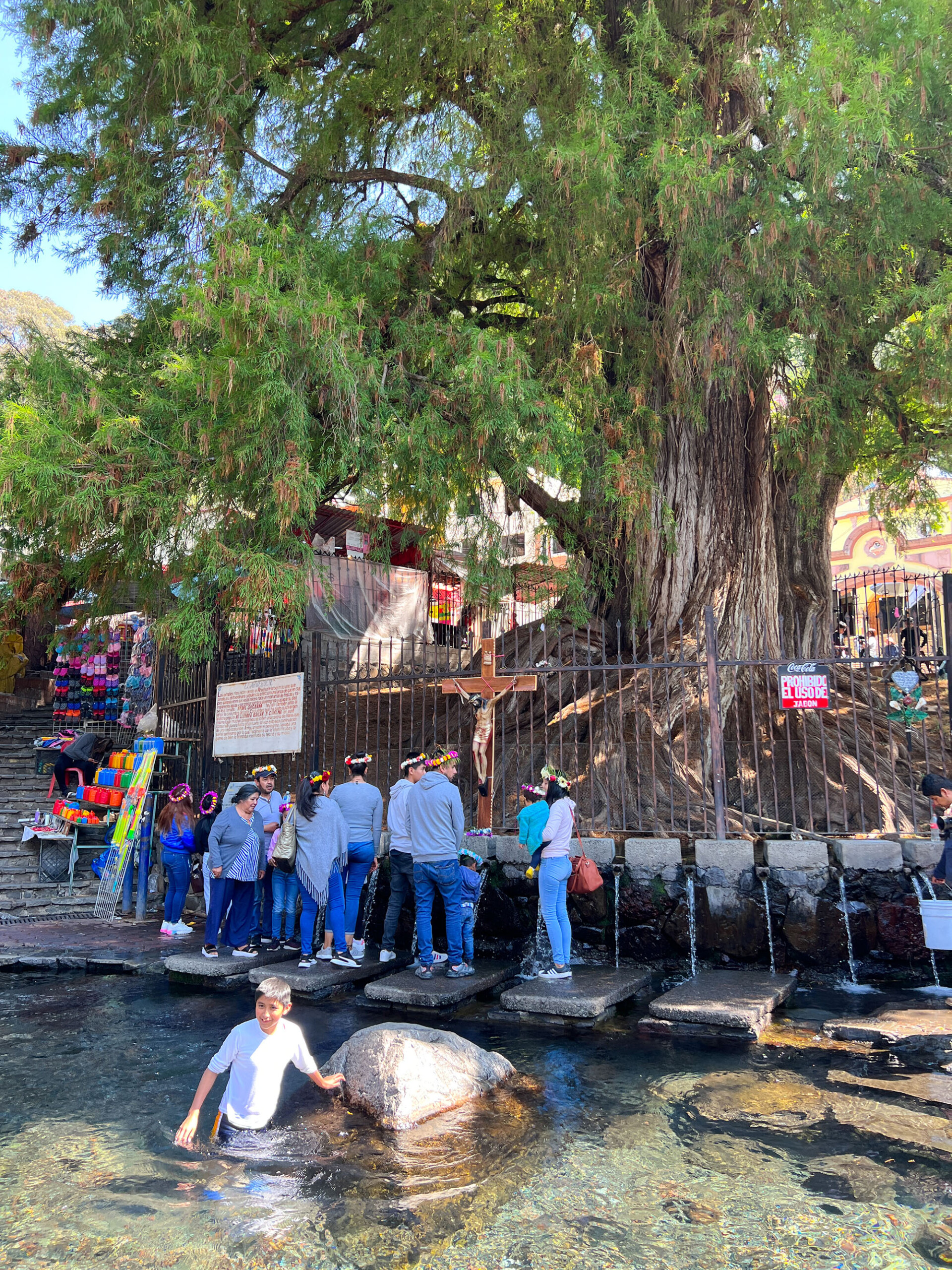 El camino hasta el santuario está envuelto en esta energía espiritual. Desde la carretera se alcanza a ver la monumental Virgen de Ocuilan, bien plantada entre los árboles de la montaña con sus 33 metros de altura de puro bronce. Después te encuentras con el ahuehuete, el árbol guardián de más de 800 años, en la entrada a Chalma. De sus raíces brota un manantial milagroso en el que hay que bañarse como parte del ritual de purificación antes de visitar el santuario. Si es tu primera vez, te pondrás una corona de flores y, ahora sí, ¡a bailar!, sin tapujos pero con devoción. Antes de dirigirte hacia el santuario, puedes alimentar la colección de exvotos que rodea al ahuehuete. Ahí, cientos de fieles han dejado cartas, dibujos, fotografías o listones con peticiones y agradecimientos.